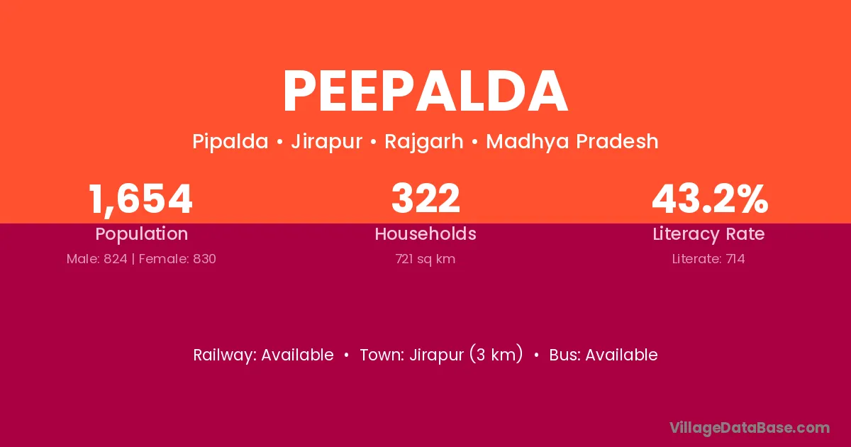 The literacy rate of Peepalda village is 55.33%. Male literacy stands at 71.49% and female literacy at 40.00%.