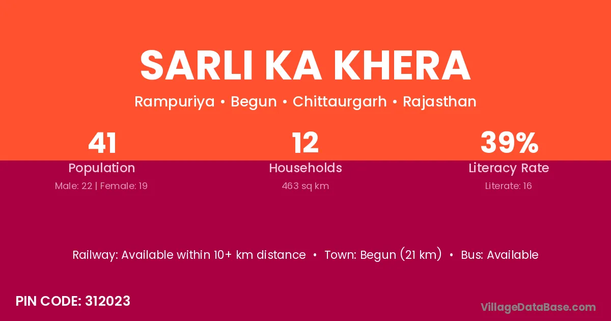 Sarli Ka Khera village has a total population of 41 people, of which 22 are males and 19 are females.