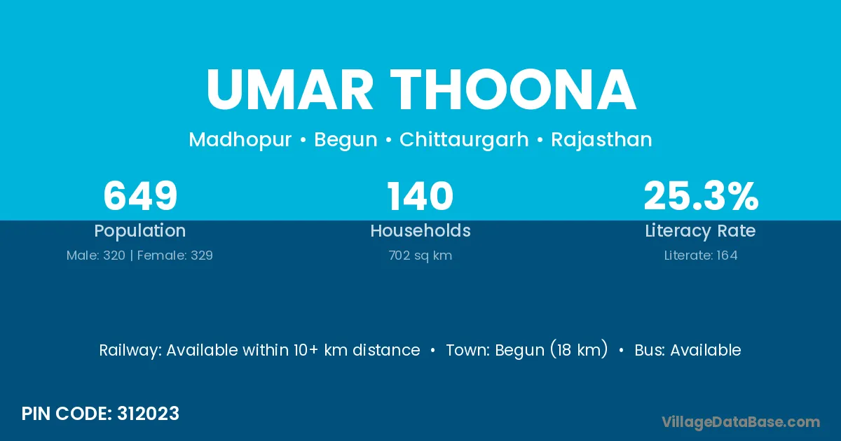Begun (18 km) is the nearest town to Umar Thoona village for major economic activities and is located approximately 18 km away.