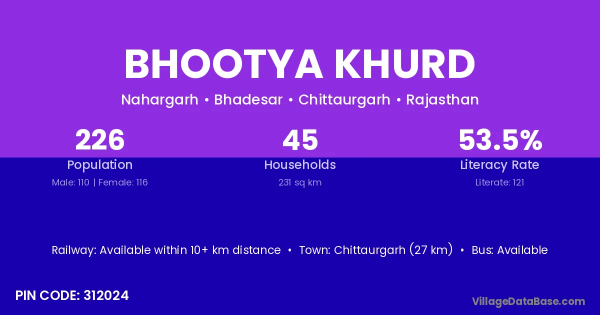Chittaurgarh (27 km) is the nearest town to Bhootya Khurd village for major economic activities and is located approximately 27 km away.