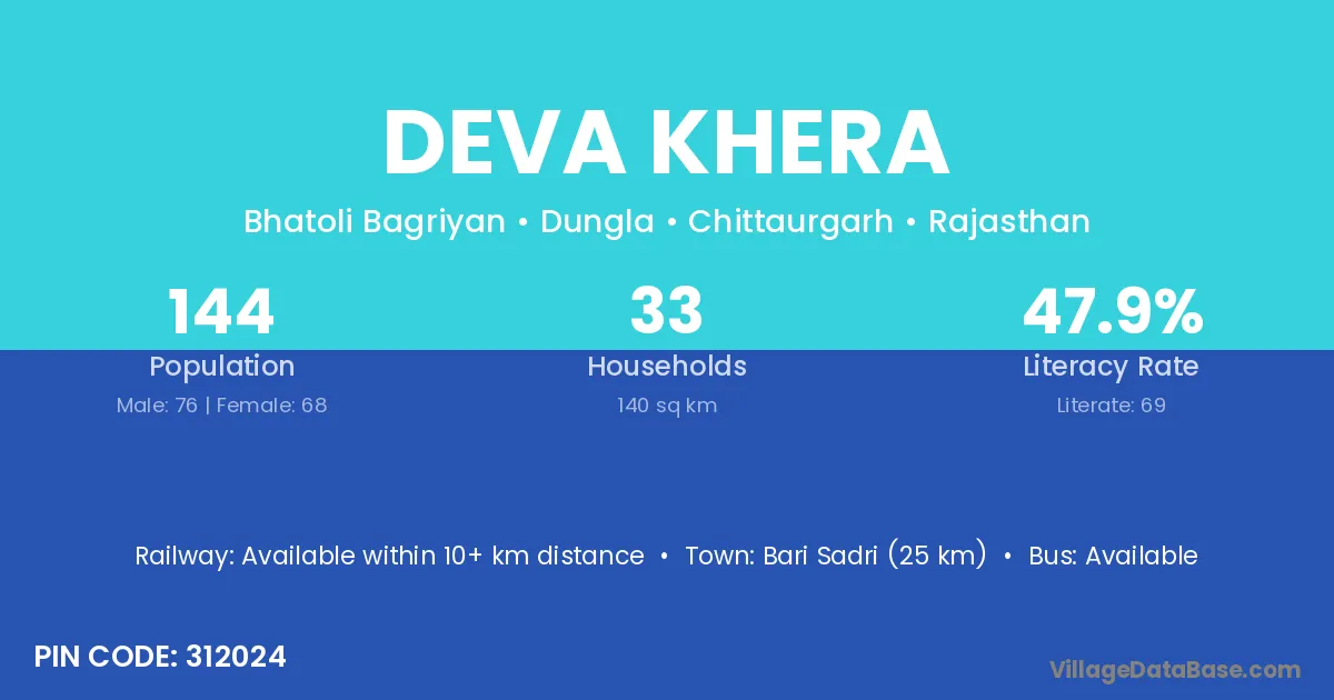 Chittaurgarh (37 km) is the nearest town to Deva Khera village for major economic activities and is located approximately 37 km away.