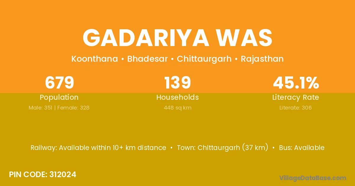 Chittaurgarh (37 km) is the nearest town to Gadariya Was village for major economic activities and is located approximately 37 km away.