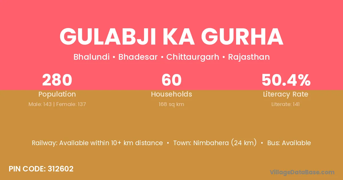 Gulabji Ka Gurha village has a total population of 280 people, of which 143 are males and 137 are females.