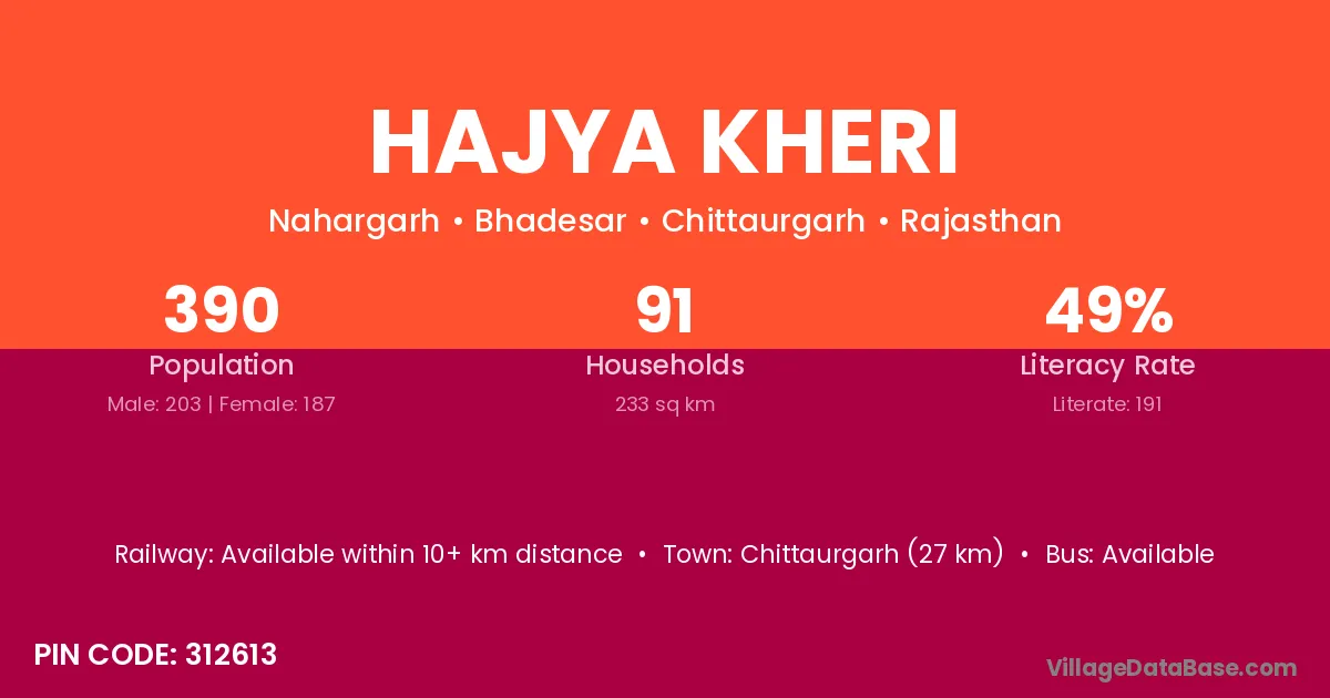 Chittaurgarh (27 km) is the nearest town to Hajya Kheri village for major economic activities and is located approximately 27 km away.