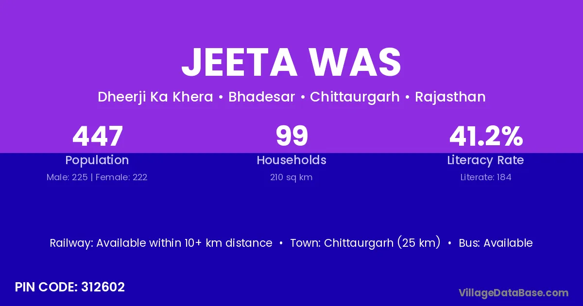 Chittaurgarh (25 km) is the nearest town to Jeeta Was village for major economic activities and is located approximately 25 km away.