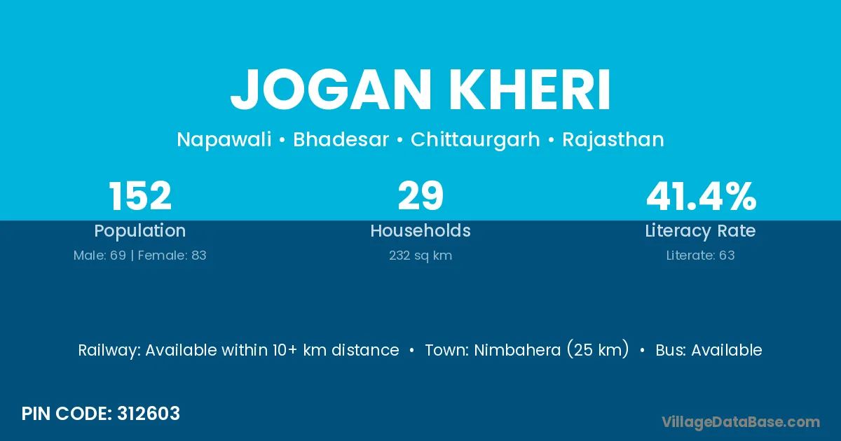 Nimbahera (25 km) is the nearest town to Jogan Kheri village for major economic activities and is located approximately 25 km away.
