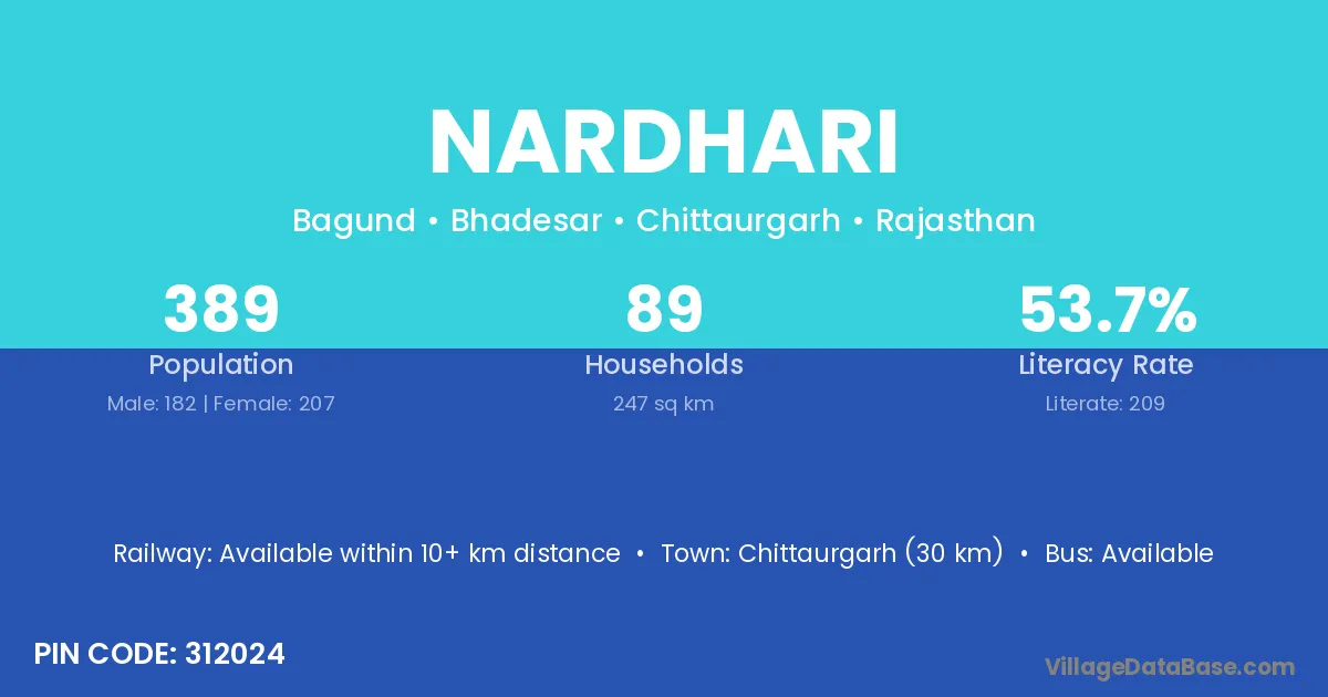 Chittaurgarh (30 km) is the nearest town to Nardhari village for major economic activities and is located approximately 30 km away.