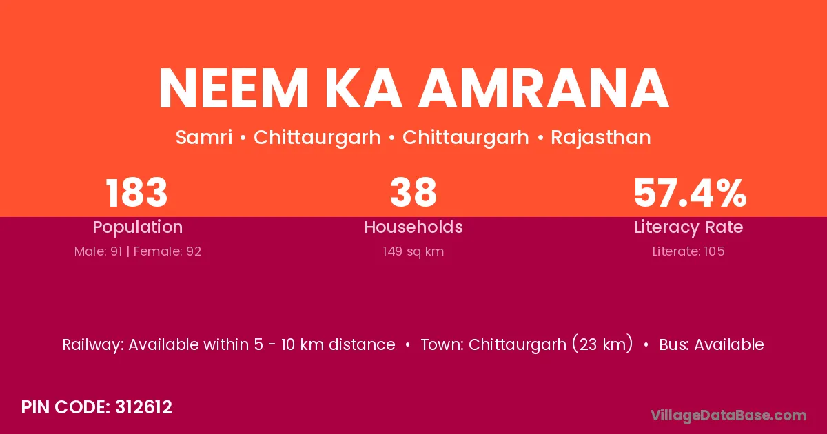 Chittaurgarh (23 km) is the nearest town to Neem Ka Amrana village for major economic activities and is located approximately 23 km away.
