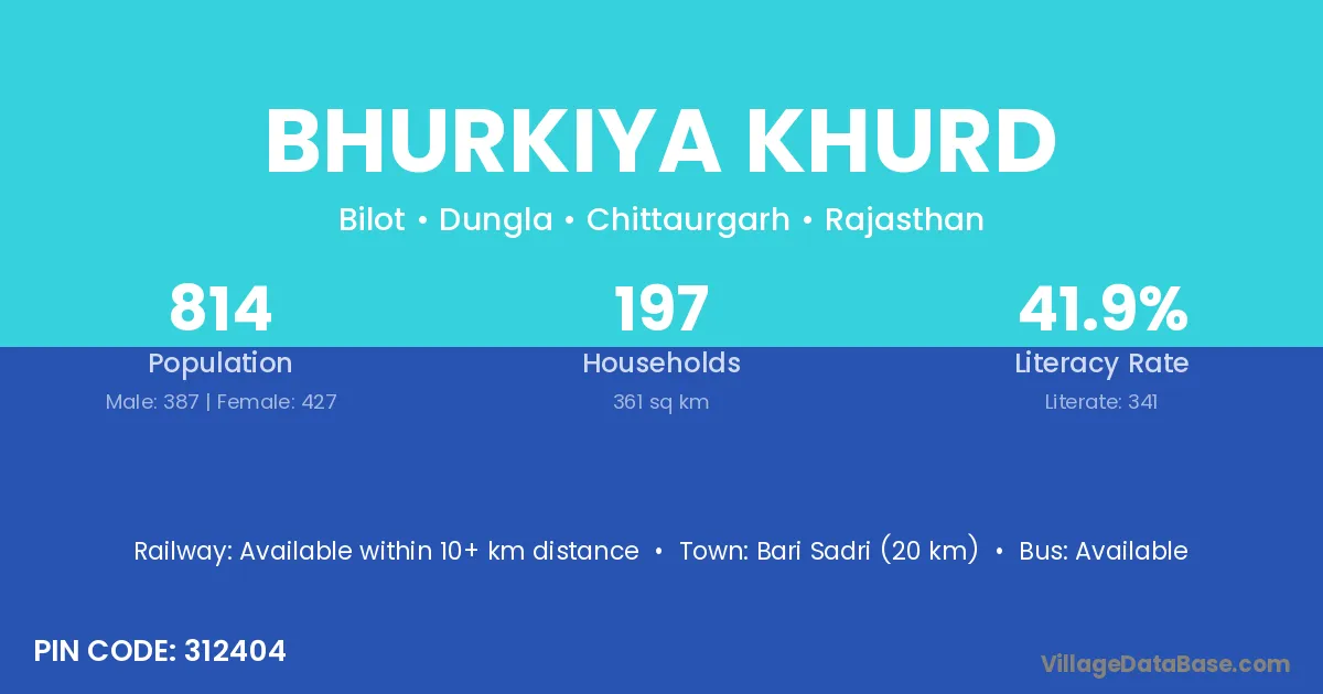 Bari Sadri (20 km) is the nearest town to Bhurkiya Khurd village for major economic activities and is located approximately 20 km away.
