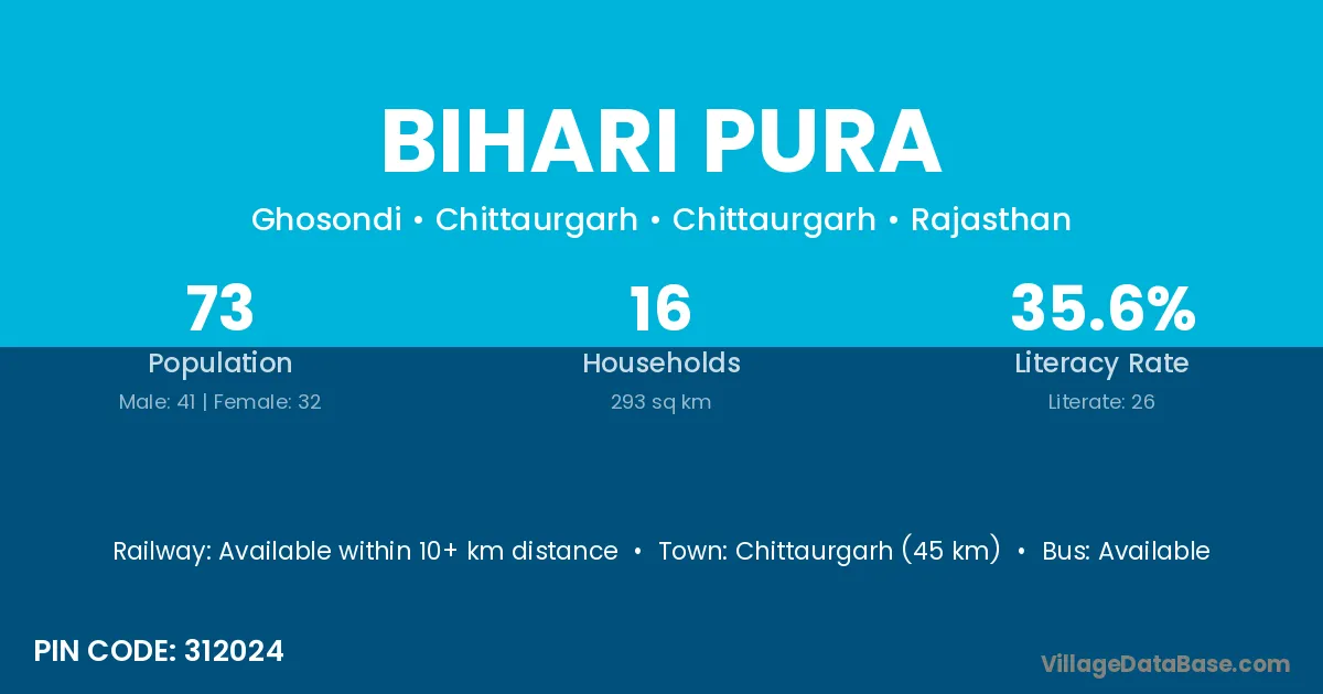 Nimbahera (36 km) is the nearest town to Bihari Pura village for major economic activities and is located approximately 36 km away.
