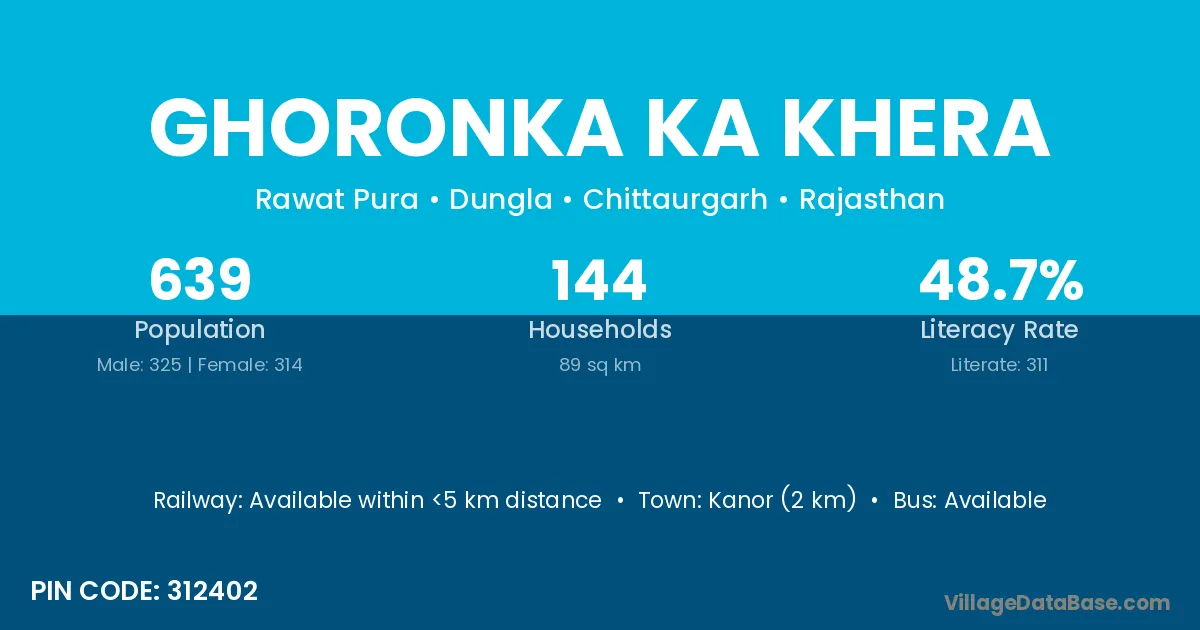Kanor (2 km) is the nearest town to Ghoronka Ka Khera village for major economic activities and is located approximately 2 km away.