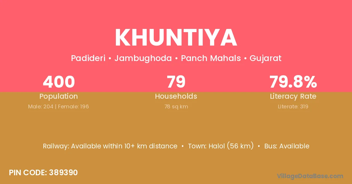 Khuntiya village has a total population of 829 people, of which 423 are males and 406 are females.