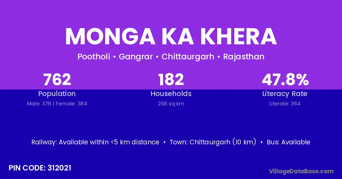 Monga Ka Khera village has a total population of 762 people, of which 378 are males and 384 are females.
