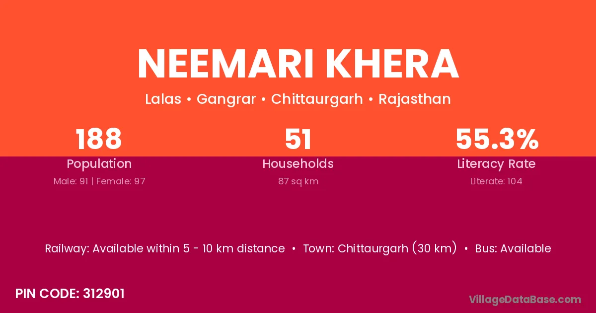 Chittaurgarh (30 km) is the nearest town to Neemari Khera village for major economic activities and is located approximately 30 km away.
