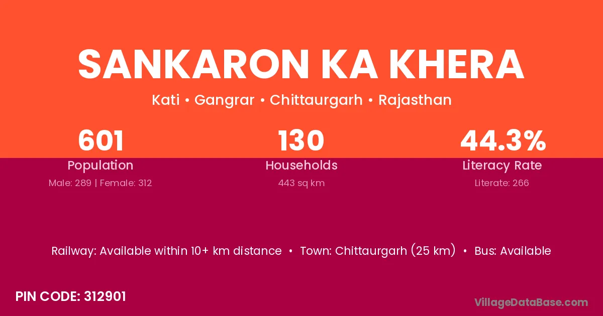 Sankaron Ka Khera village has a total population of 601 people, of which 289 are males and 312 are females.