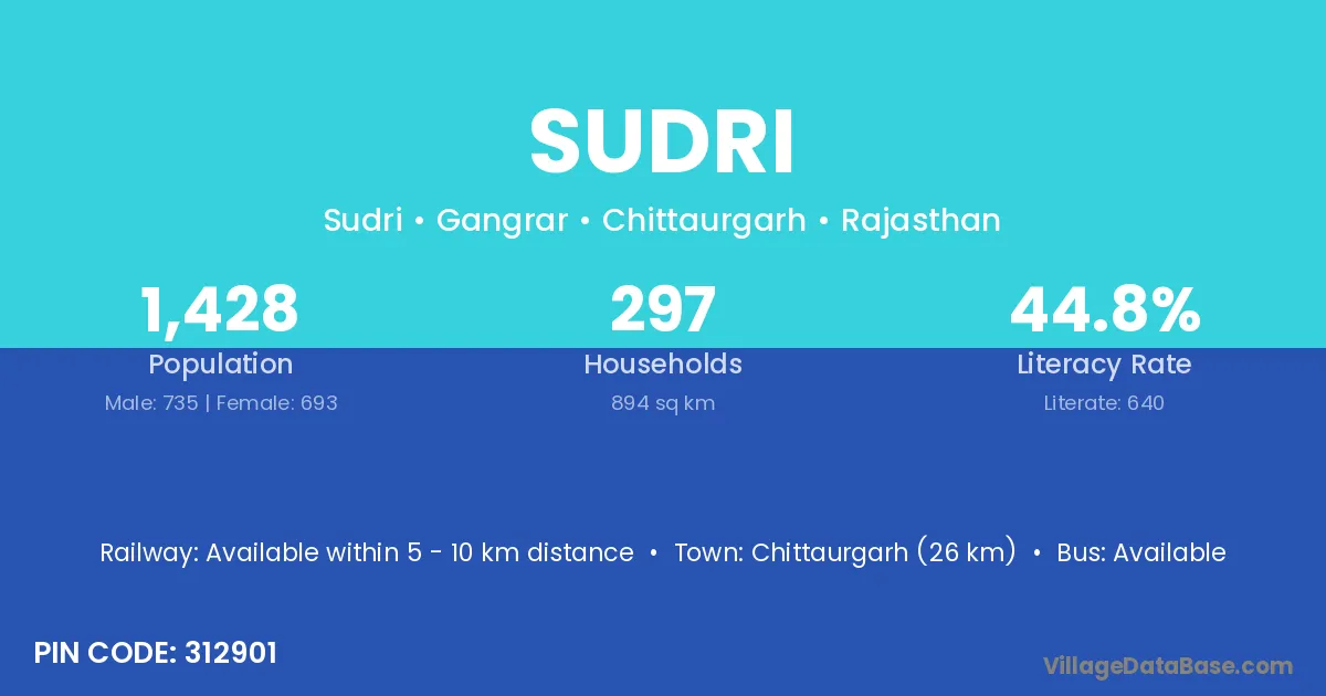 Chittaurgarh (26 km) is the nearest town to Sudri village for major economic activities and is located approximately 26 km away.