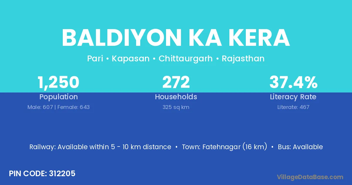 Baldiyon Ka Kera village has a total population of 1,250 people, of which 607 are males and 643 are females.