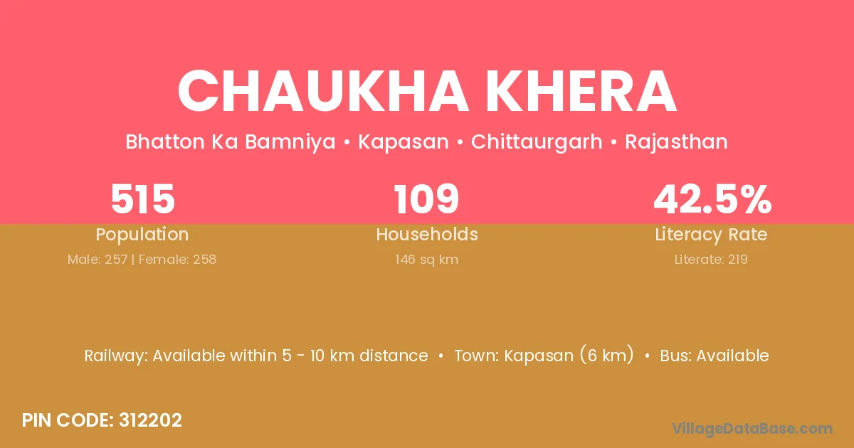 Kapasan (6 km) is the nearest town to Chaukha Khera village for major economic activities and is located approximately 6 km away.