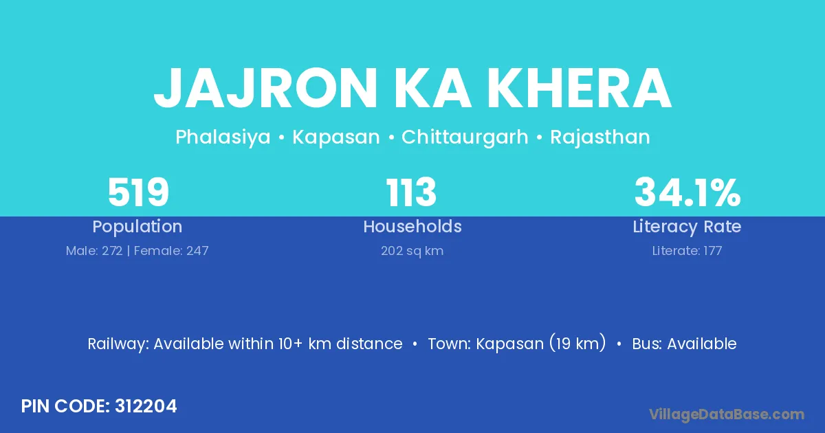 Kapasan (19 km) is the nearest town to Jajron Ka Khera village for major economic activities and is located approximately 19 km away.