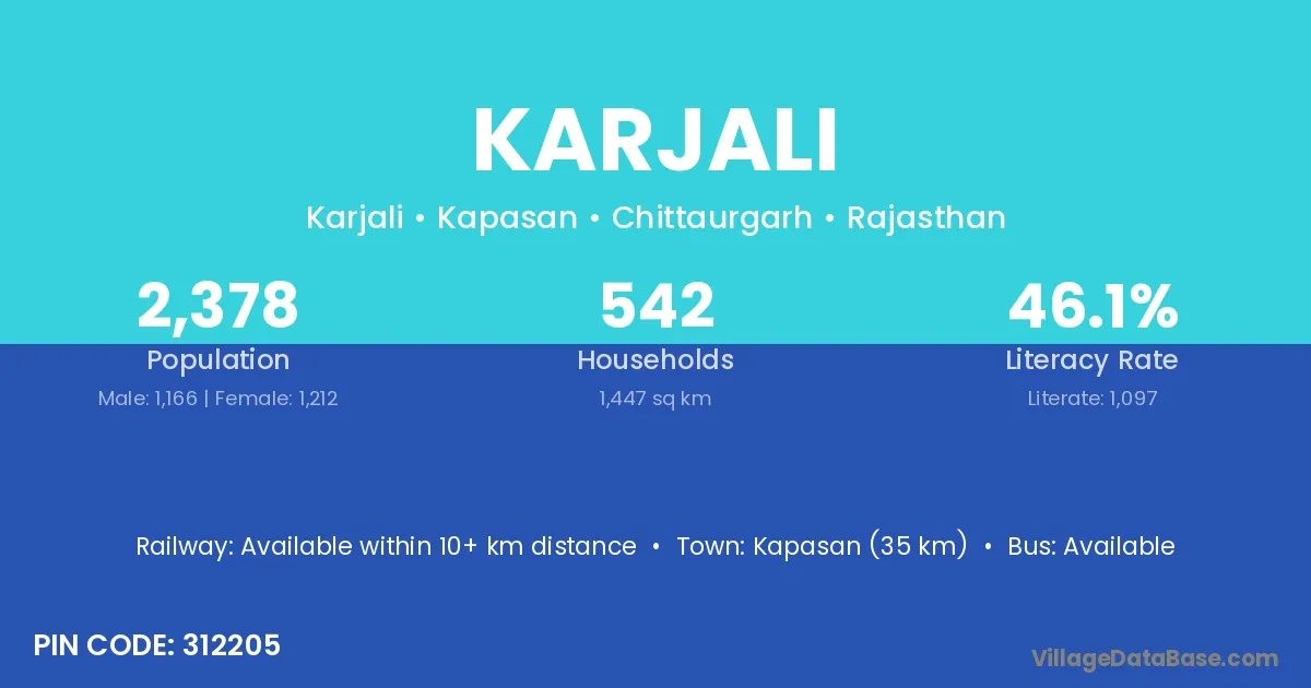 Kapasan (35 km) is the nearest town to Karjali village for major economic activities and is located approximately 35 km away.