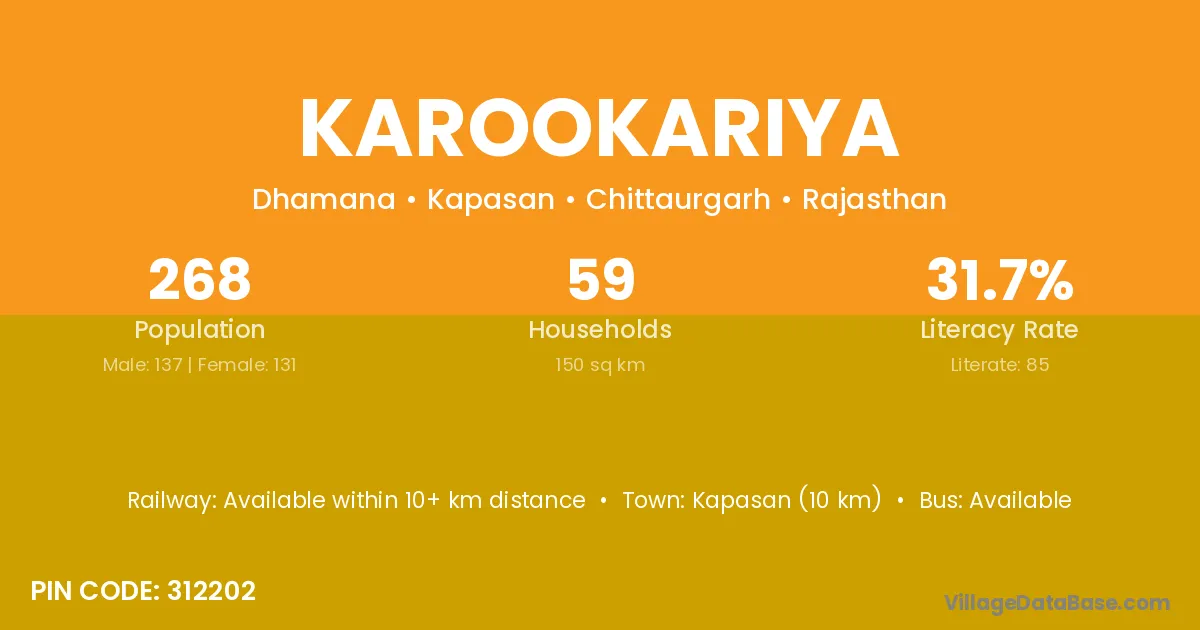 Karookariya village has a total population of 268 people, of which 137 are males and 131 are females.
