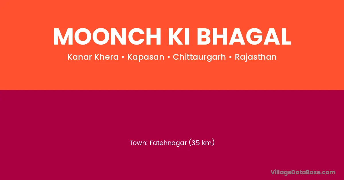 Fatehnagar (35 km) is the nearest town to Moonch Ki Bhagal village for major economic activities and is located approximately 35 km away.