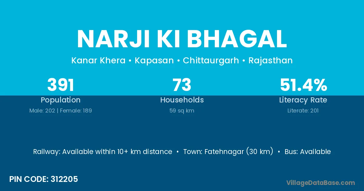 Narji Ki Bhagal village has a total population of 391 people, of which 202 are males and 189 are females.