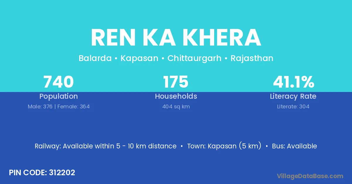 Kapasan (5 km) is the nearest town to Ren Ka Khera village for major economic activities and is located approximately 5 km away.