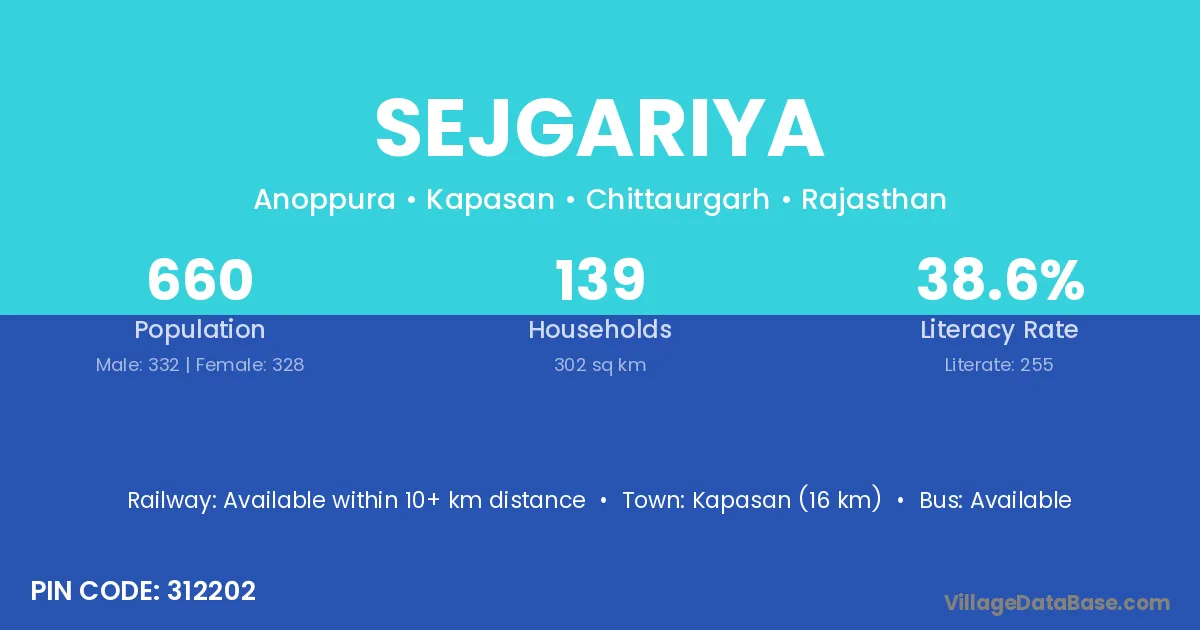 Sejgariya village has a total population of 660 people, of which 332 are males and 328 are females.