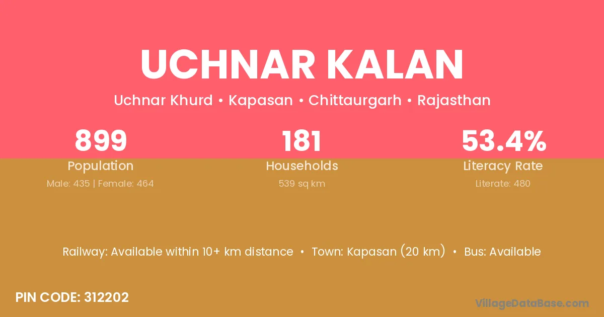 Kapasan (20 km) is the nearest town to Uchnar Kalan village for major economic activities and is located approximately 20 km away.