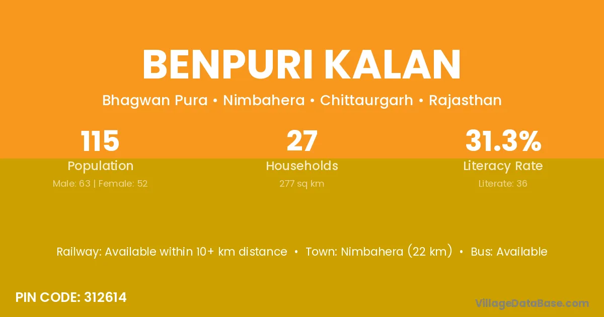 Nimbahera (22 km) is the nearest town to Benpuri Kalan village for major economic activities and is located approximately 22 km away.