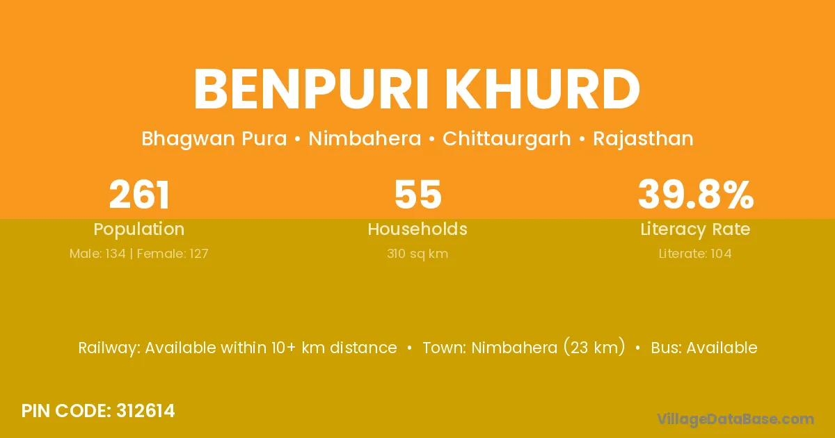 Nimbahera (23 km) is the nearest town to Benpuri Khurd village for major economic activities and is located approximately 23 km away.