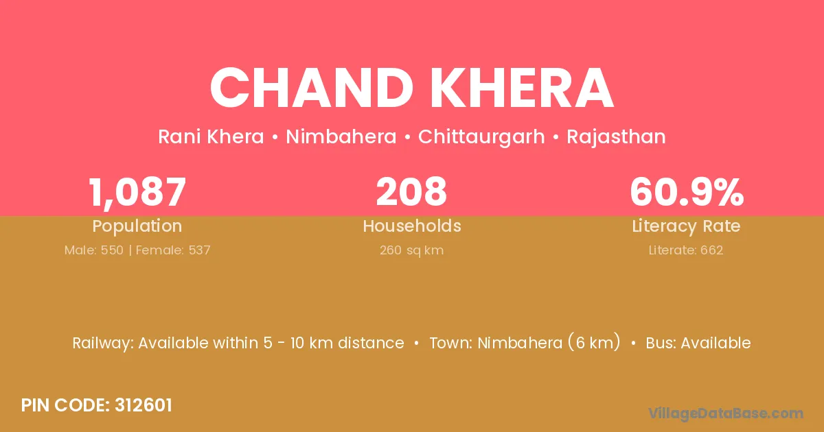 Nimbahera (6 km) is the nearest town to Chand Khera village for major economic activities and is located approximately 6 km away.