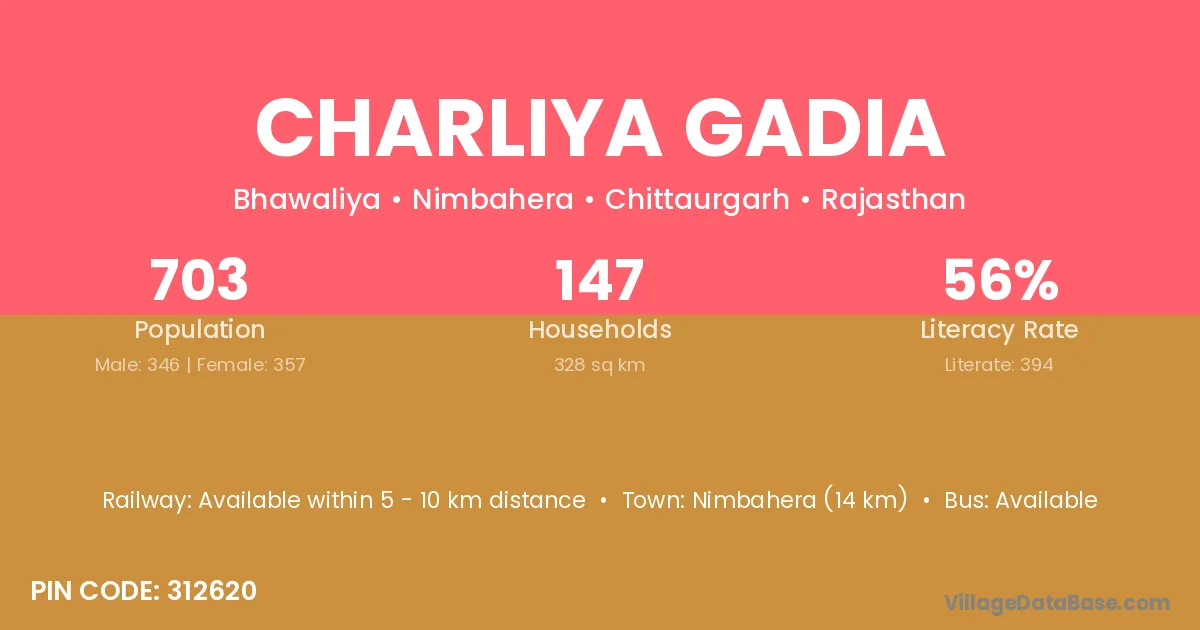 Nimbahera (14 km) is the nearest town to Charliya Gadia village for major economic activities and is located approximately 14 km away.