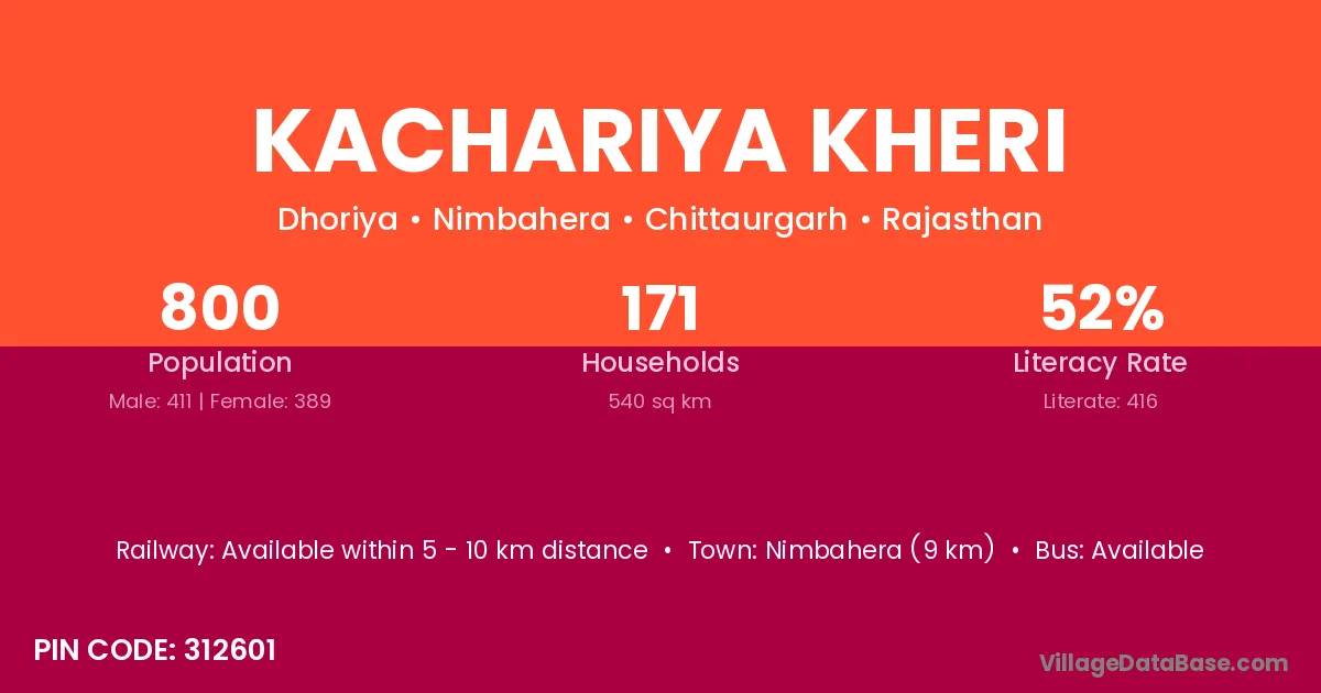 Nimbahera (9 km) is the nearest town to Kachariya Kheri village for major economic activities and is located approximately 9 km away.