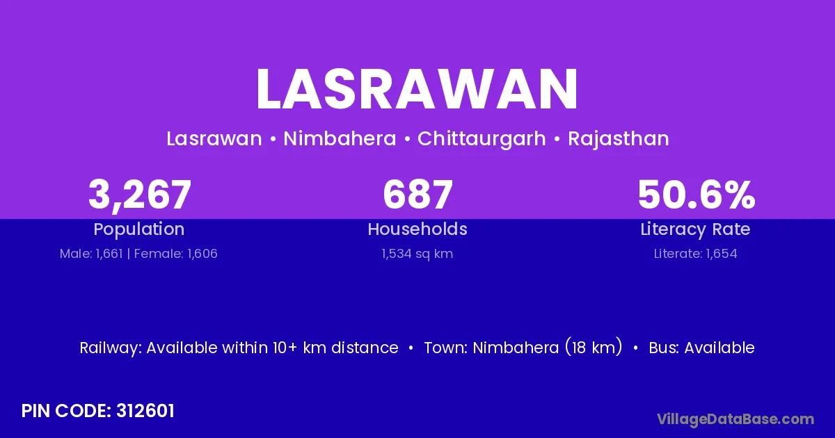 Nimbahera (18 km) is the nearest town to Lasrawan village for major economic activities and is located approximately 18 km away.