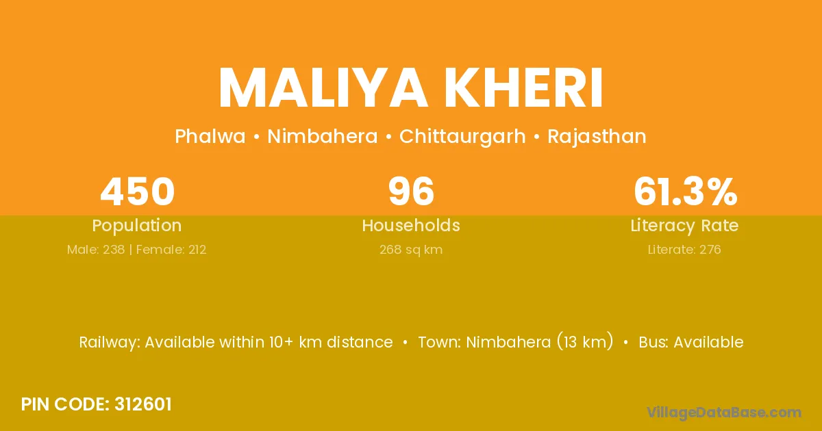 Nimbahera (13 km) is the nearest town to Maliya Kheri village for major economic activities and is located approximately 13 km away.