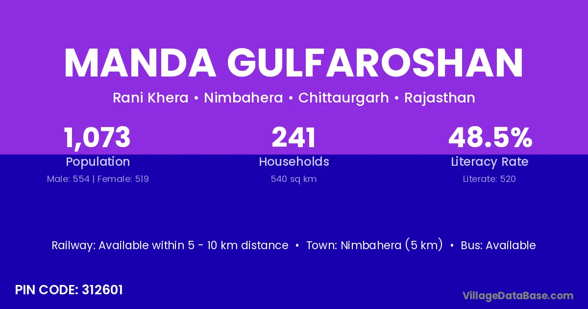 Nimbahera (5 km) is the nearest town to Manda Gulfaroshan village for major economic activities and is located approximately 5 km away.