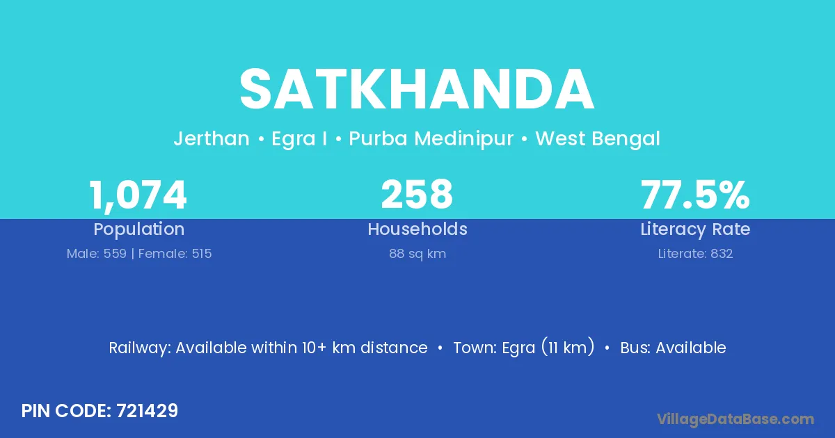 The literacy rate of Satkhanda village is 51.37%. Male literacy stands at 68.31% and female literacy at 34.57%.