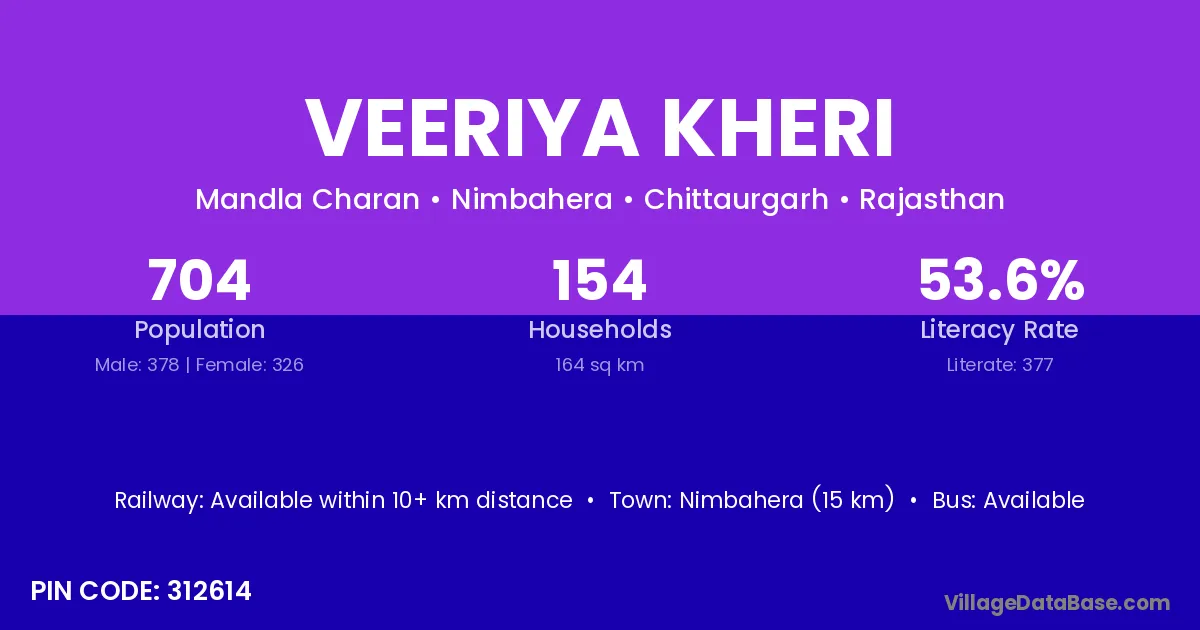 Nimbahera (15 km) is the nearest town to Veeriya Kheri village for major economic activities and is located approximately 15 km away.