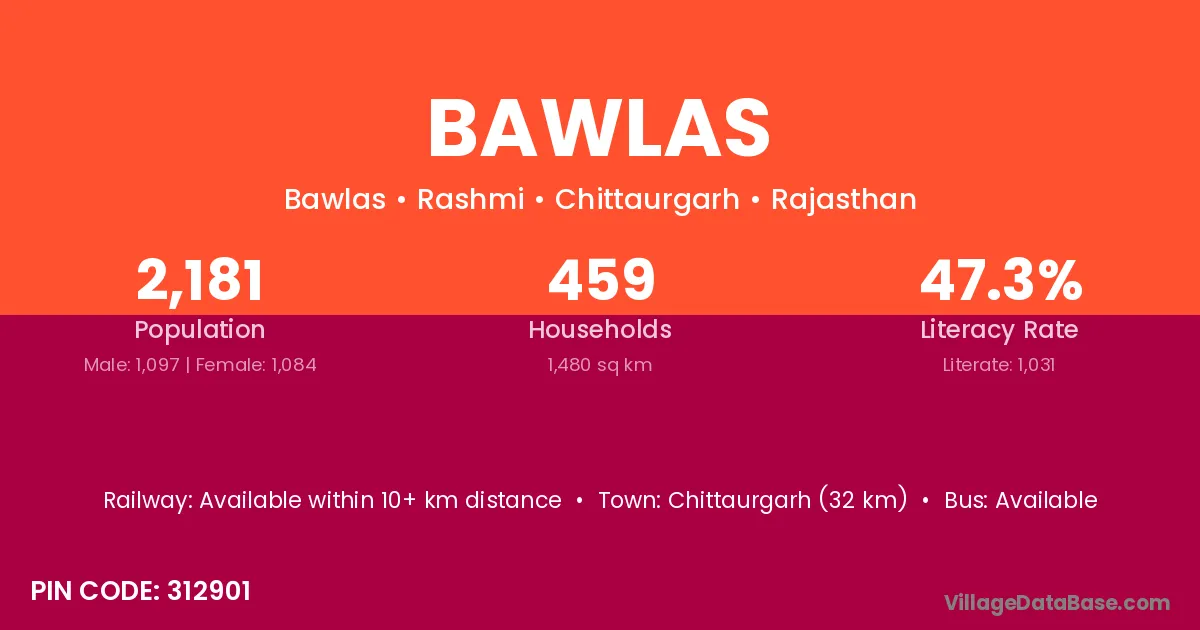 Chittaurgarh (32 km) is the nearest town to Bawlas village for major economic activities and is located approximately 32 km away.