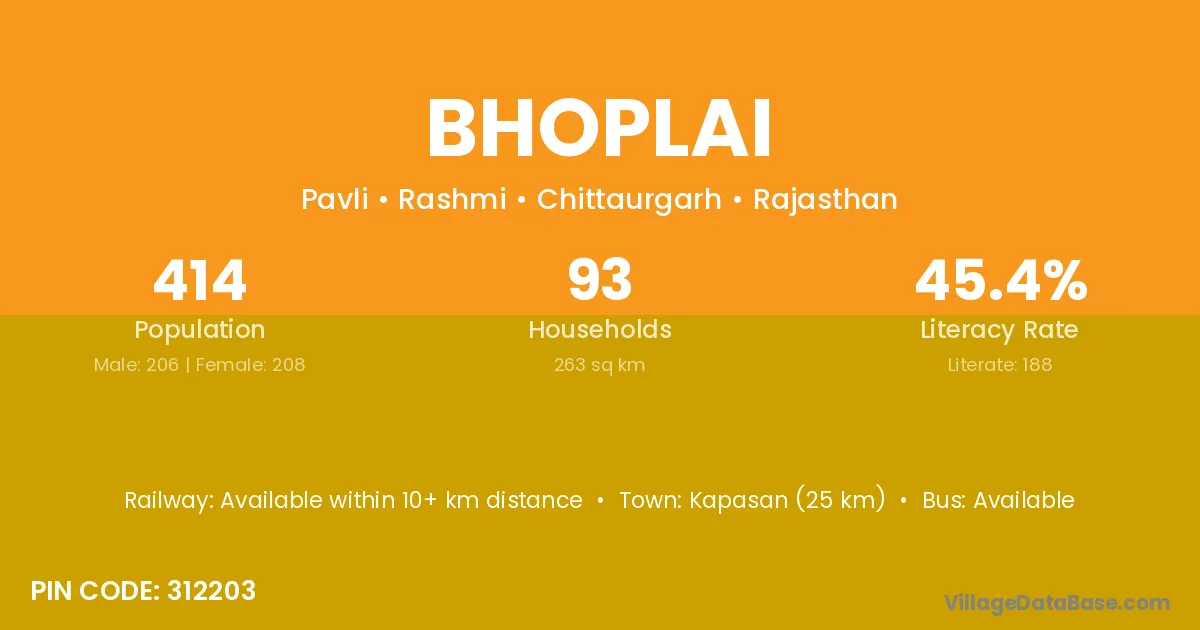 Bhoplai village has a total population of 414 people, of which 206 are males and 208 are females.