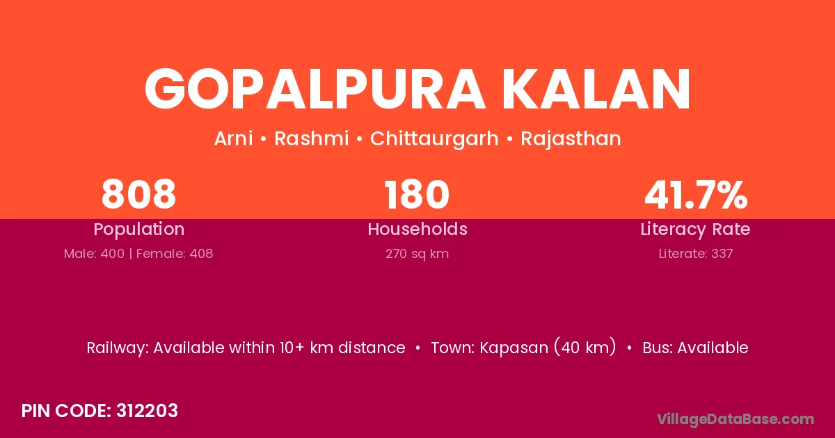 Kapasan (40 km) is the nearest town to Gopalpura Kalan village for major economic activities and is located approximately 40 km away.