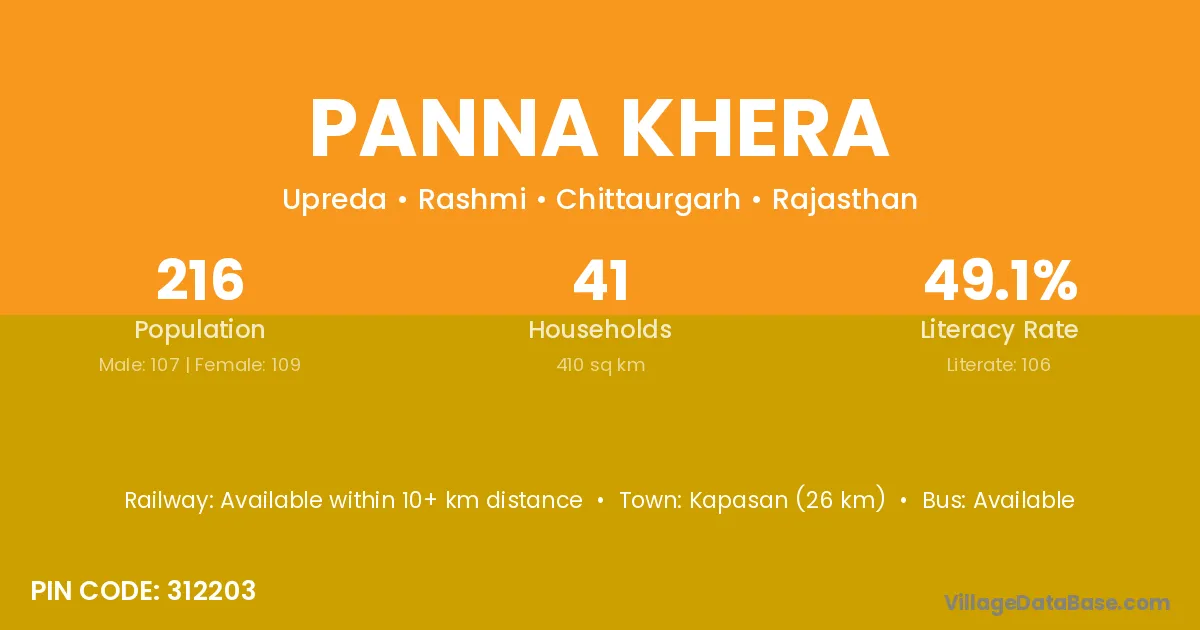 Kapasan (26 km) is the nearest town to Panna Khera village for major economic activities and is located approximately 26 km away.