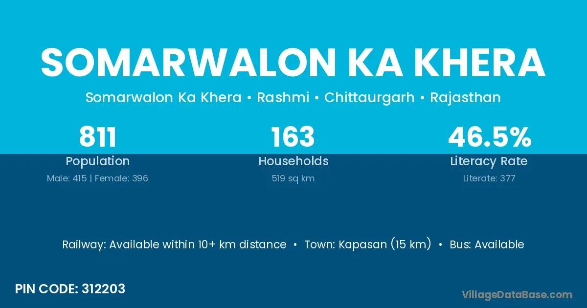 Somarwalon Ka Khera village has a total population of 811 people, of which 415 are males and 396 are females.