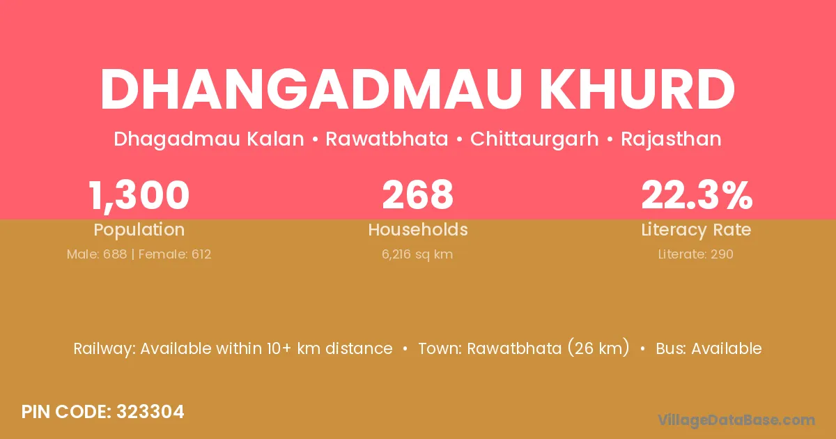 Rawatbhata (26 km) is the nearest town to Dhangadmau Khurd village for major economic activities and is located approximately 26 km away.