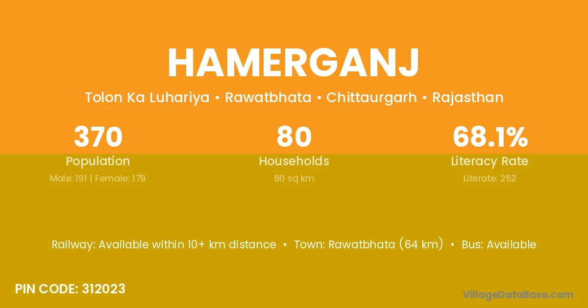 Rawatbhata (64 km) is the nearest town to Hamerganj village for major economic activities and is located approximately 64 km away.