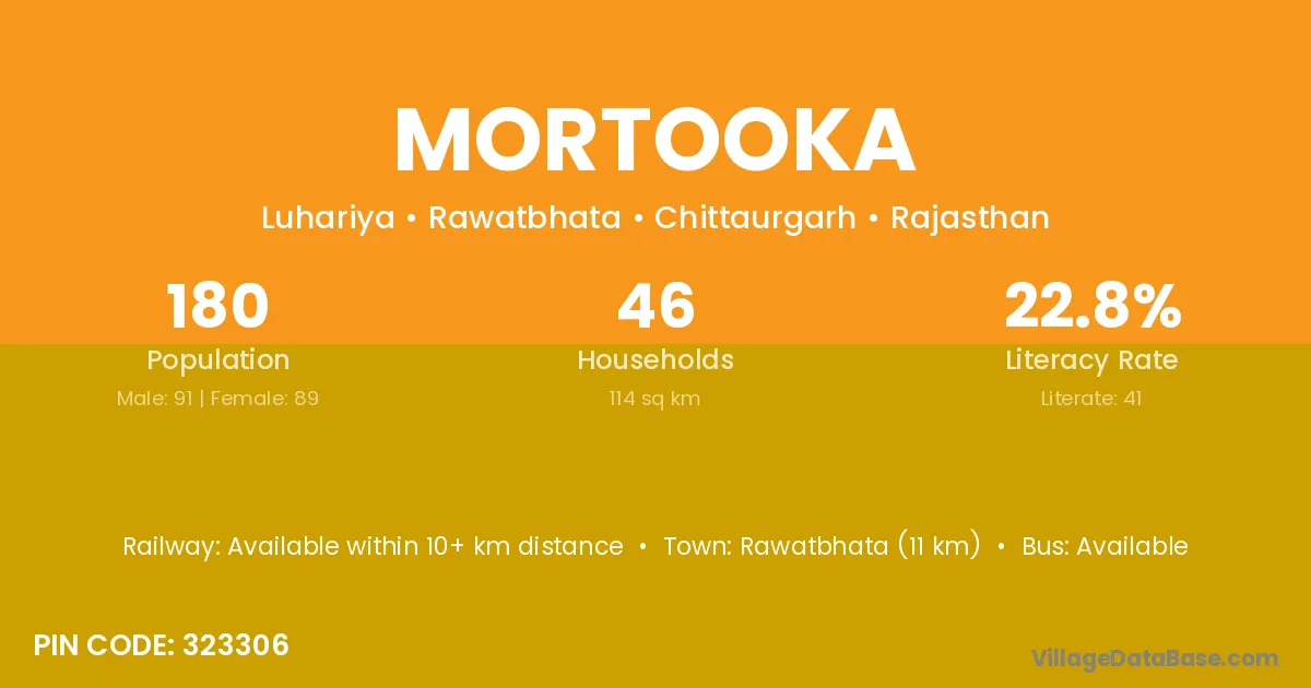Rawatbhata (11 km) is the nearest town to Mortooka village for major economic activities and is located approximately 11 km away.