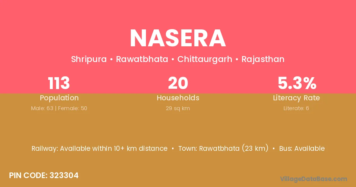 Rawatbhata (23 km) is the nearest town to Nasera village for major economic activities and is located approximately 23 km away.