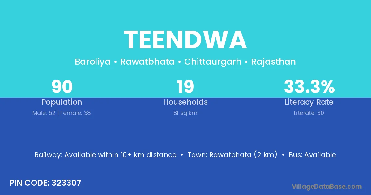 Rawatbhata (2 km) is the nearest town to Teendwa village for major economic activities and is located approximately 2 km away.